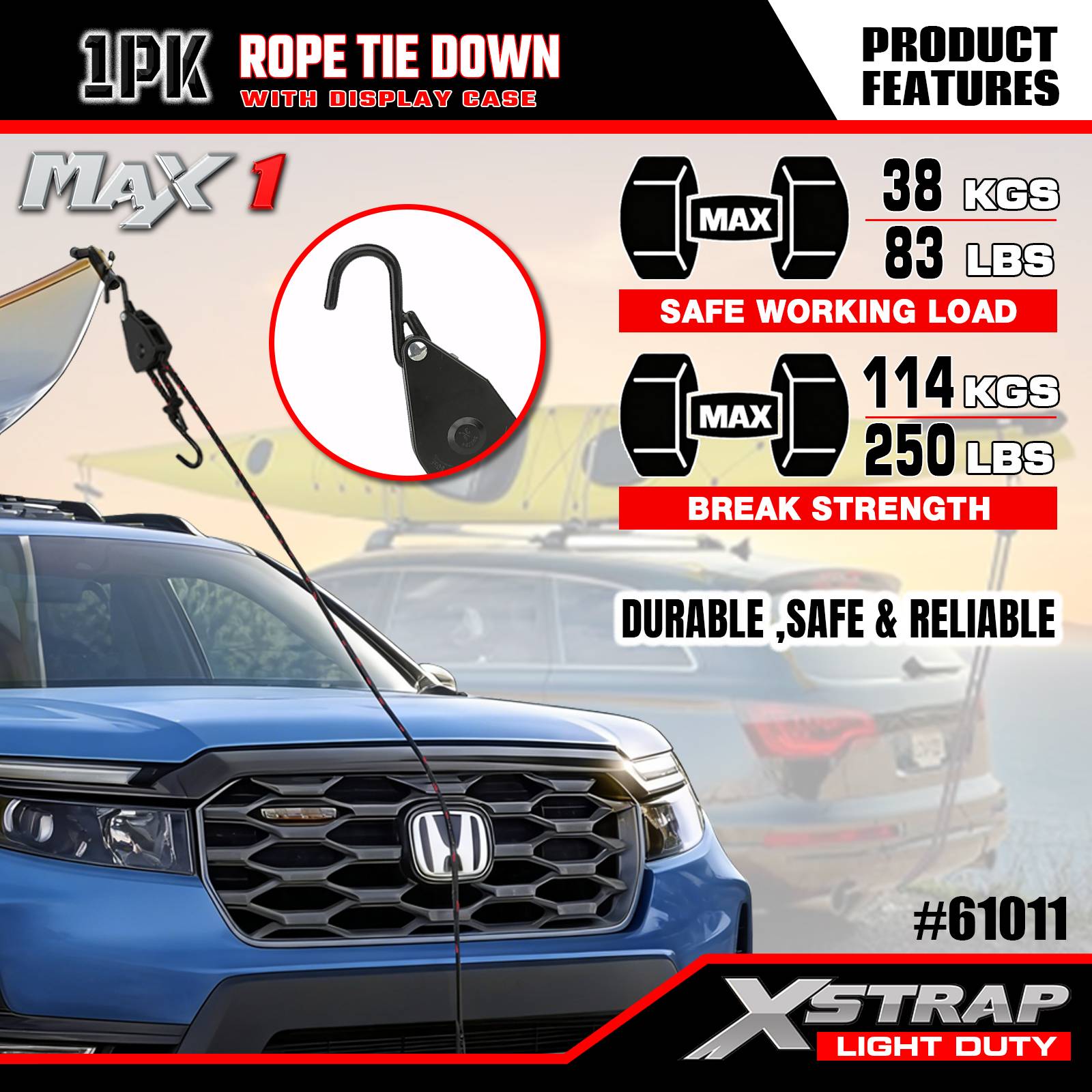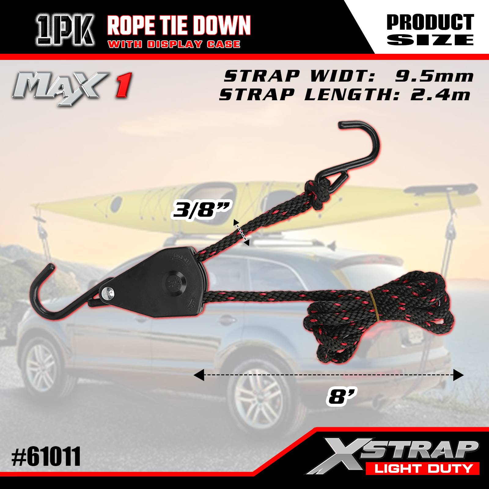 Xstrap 1 pakke-taufestestropper, 3/8” x 8’–83 lbs lastehette- 250 lbs bruddstyrke-lasteremmer for sikring av lett last (kajakker, utstyr, småutstyr) til kjøretøy/reoler