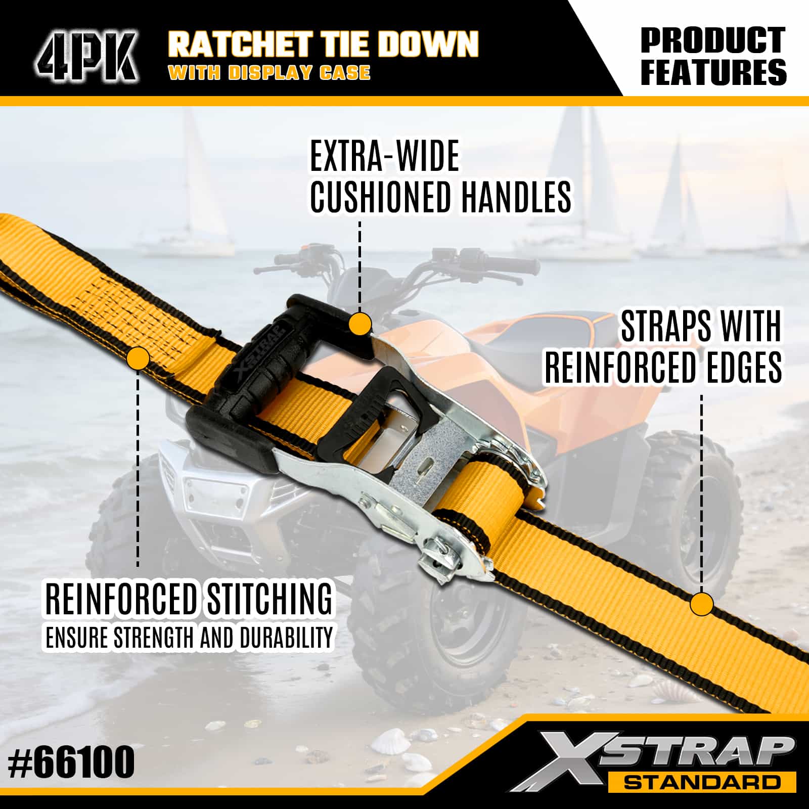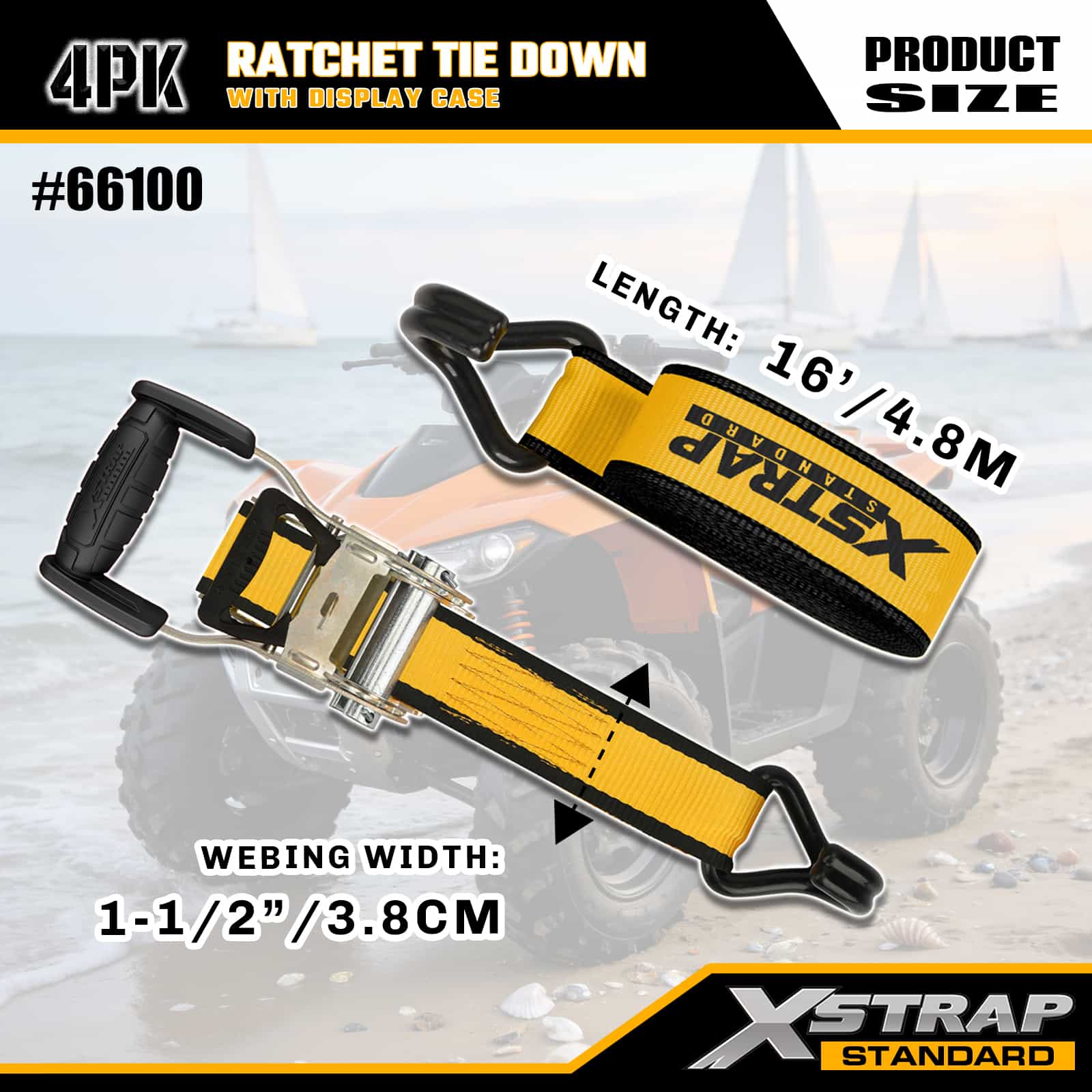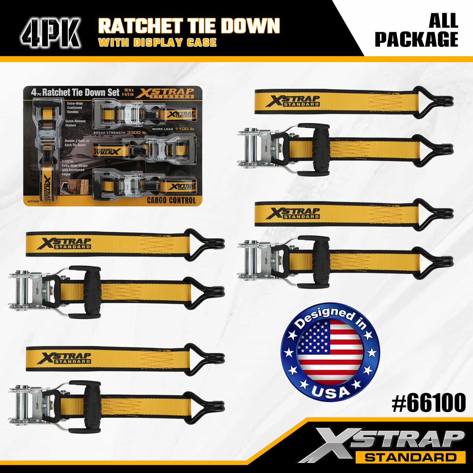 Xstrap 4-pack skrallefeste med doble J-kroker, 1-1/2" x 16" polyester feste-rem Trekk skrallestropp, 1100lbs Kapasitet Lastefeste med doble J-kroker for pickup, SUV, bilstativ, motorsykkel, lett fiskebåt, snøscooter, jetski.
