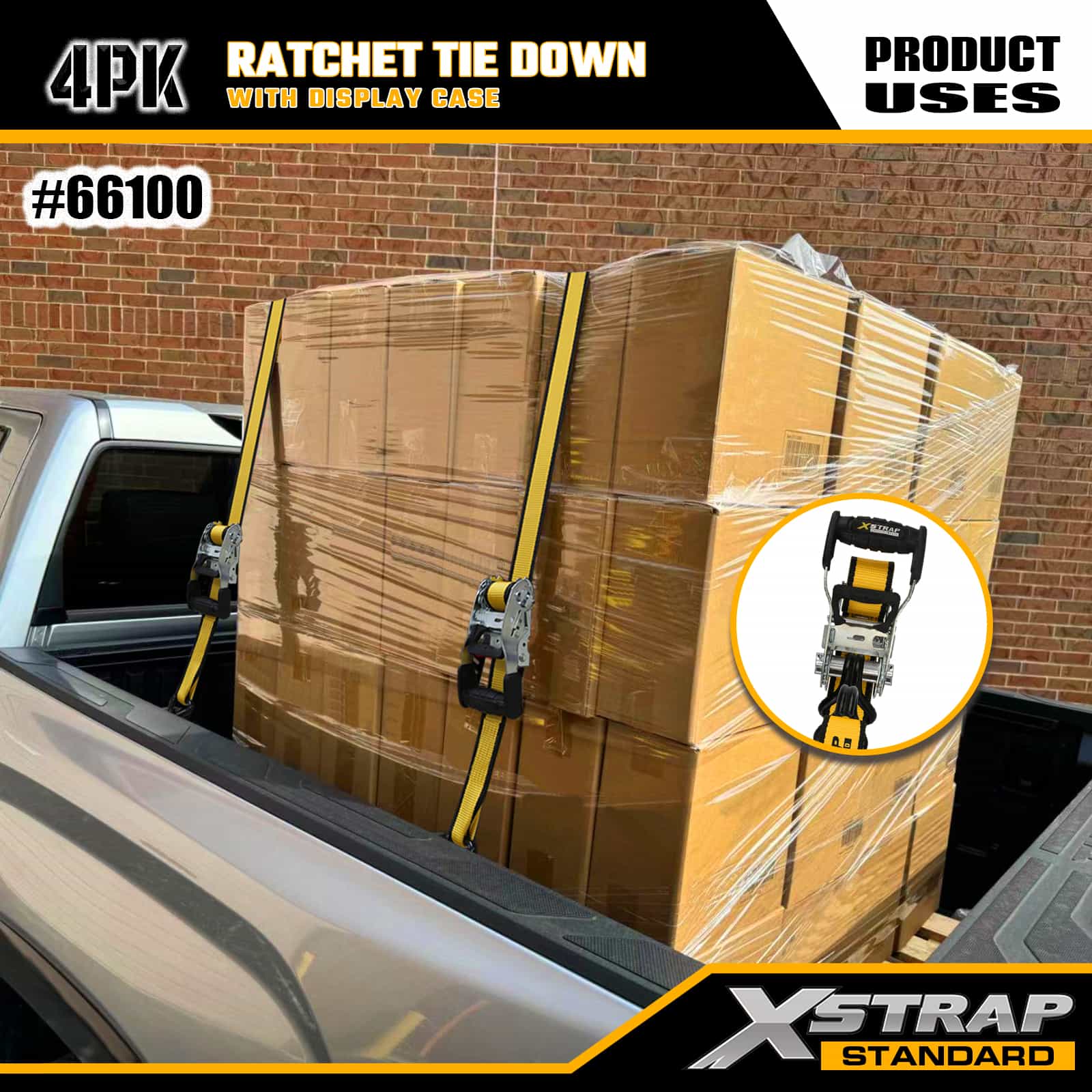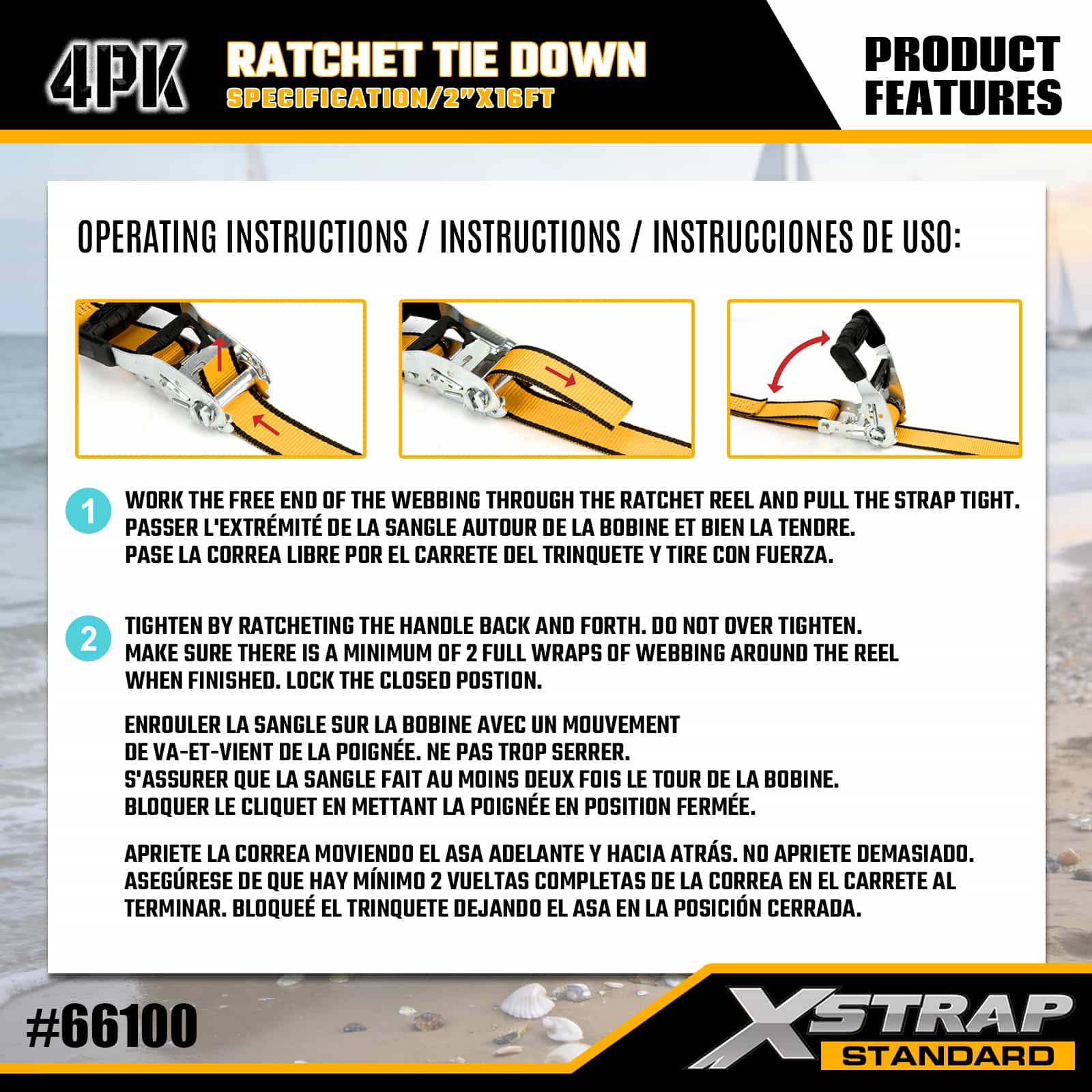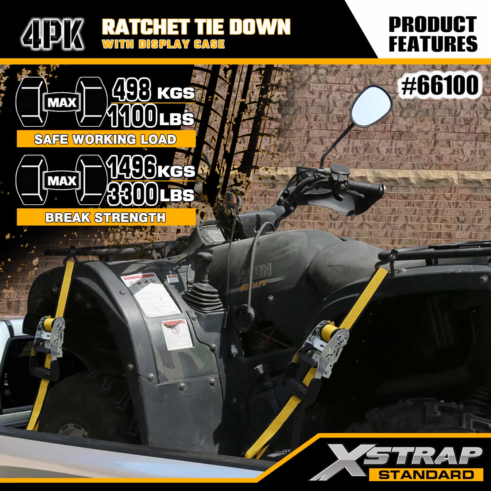 Xstrap 4-pack skrallefeste med doble J-kroker, 1-1/2" x 16" polyester feste-rem Trekk skrallestropp, 1100lbs Kapasitet Lastefeste med doble J-kroker for pickup, SUV, bilstativ, motorsykkel, lett fiskebåt, snøscooter, jetski.