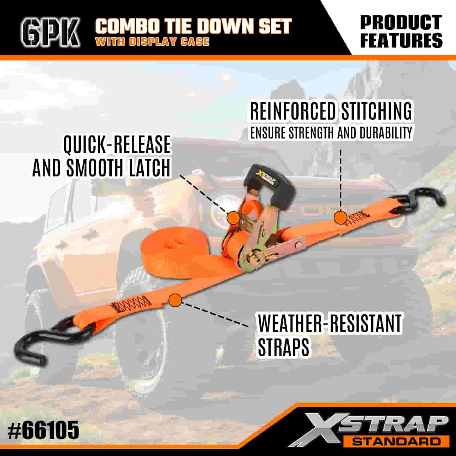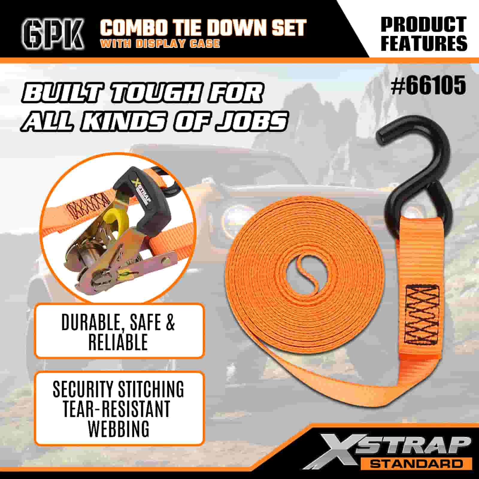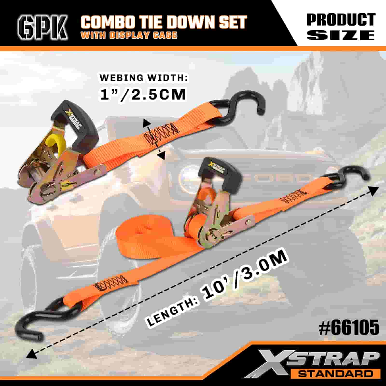 Xstrap 6 Pack Aluminium Ratchet Tie Down, 1” x 14″ og 1” x 10″ Polyester Tie Down Strap Pull Ratchet Strap, 500lbs og 1100lbs Kapasitet Lastesurring Sikringsstropper med S-kroker for Cargo Rack-kontroll, SU-motorsykkel.