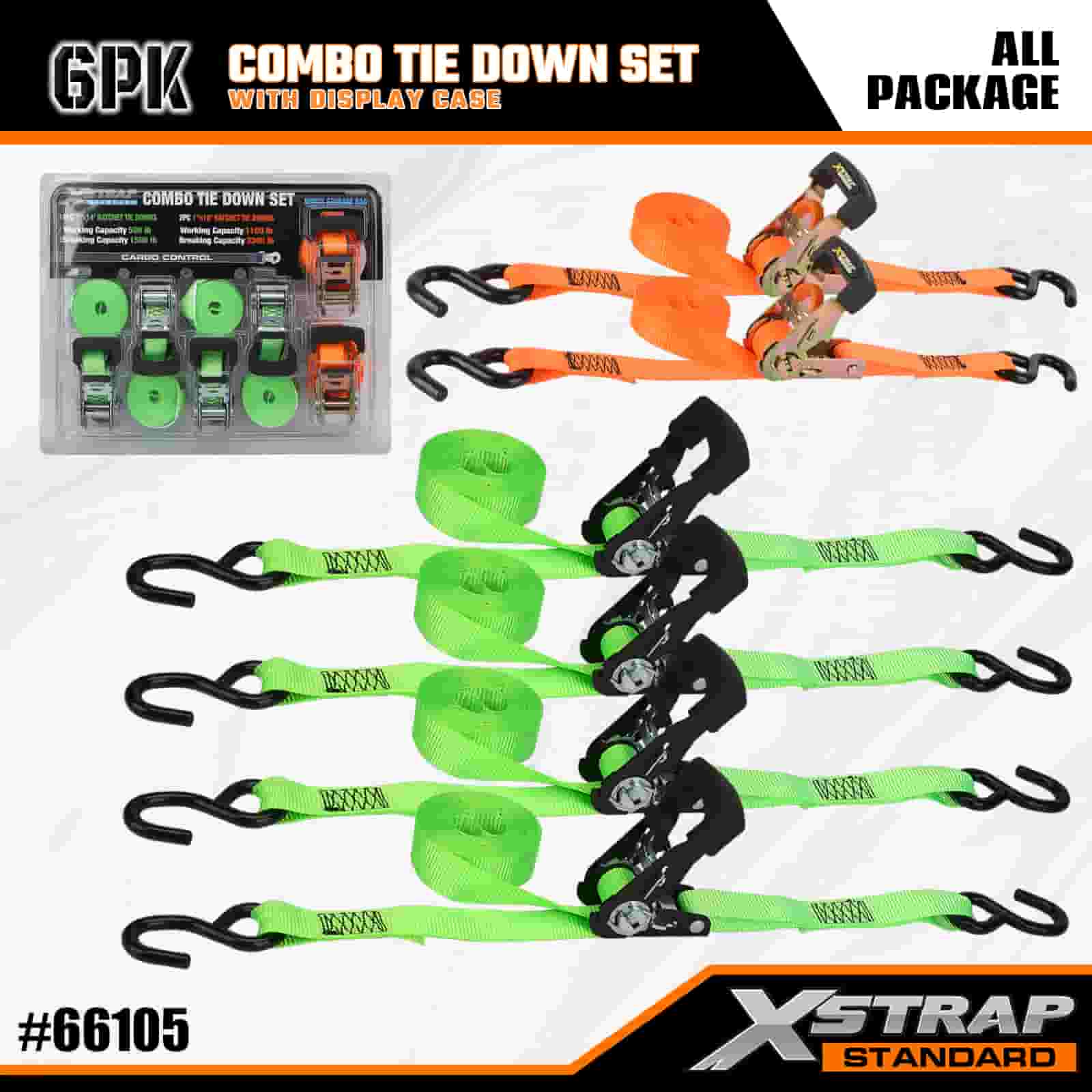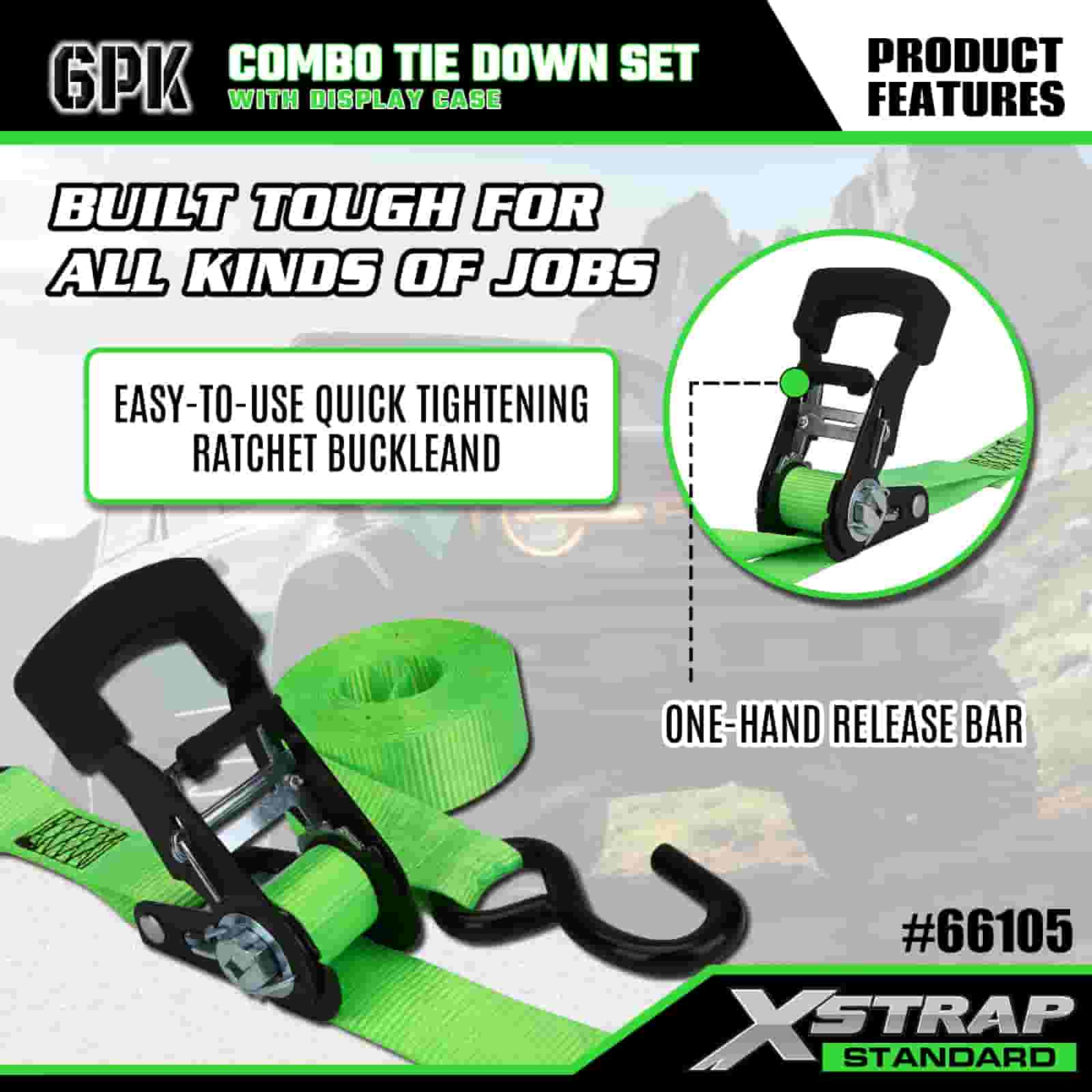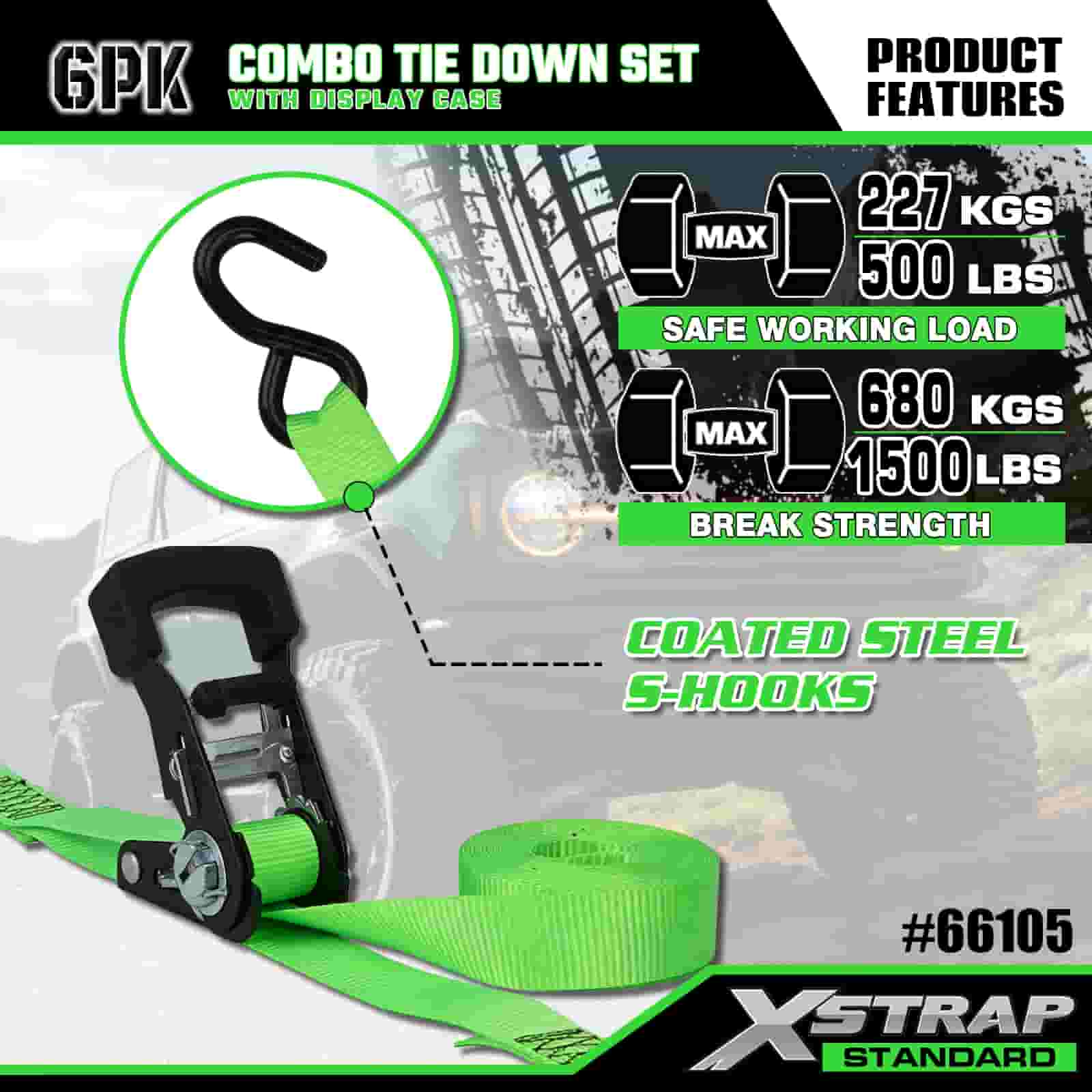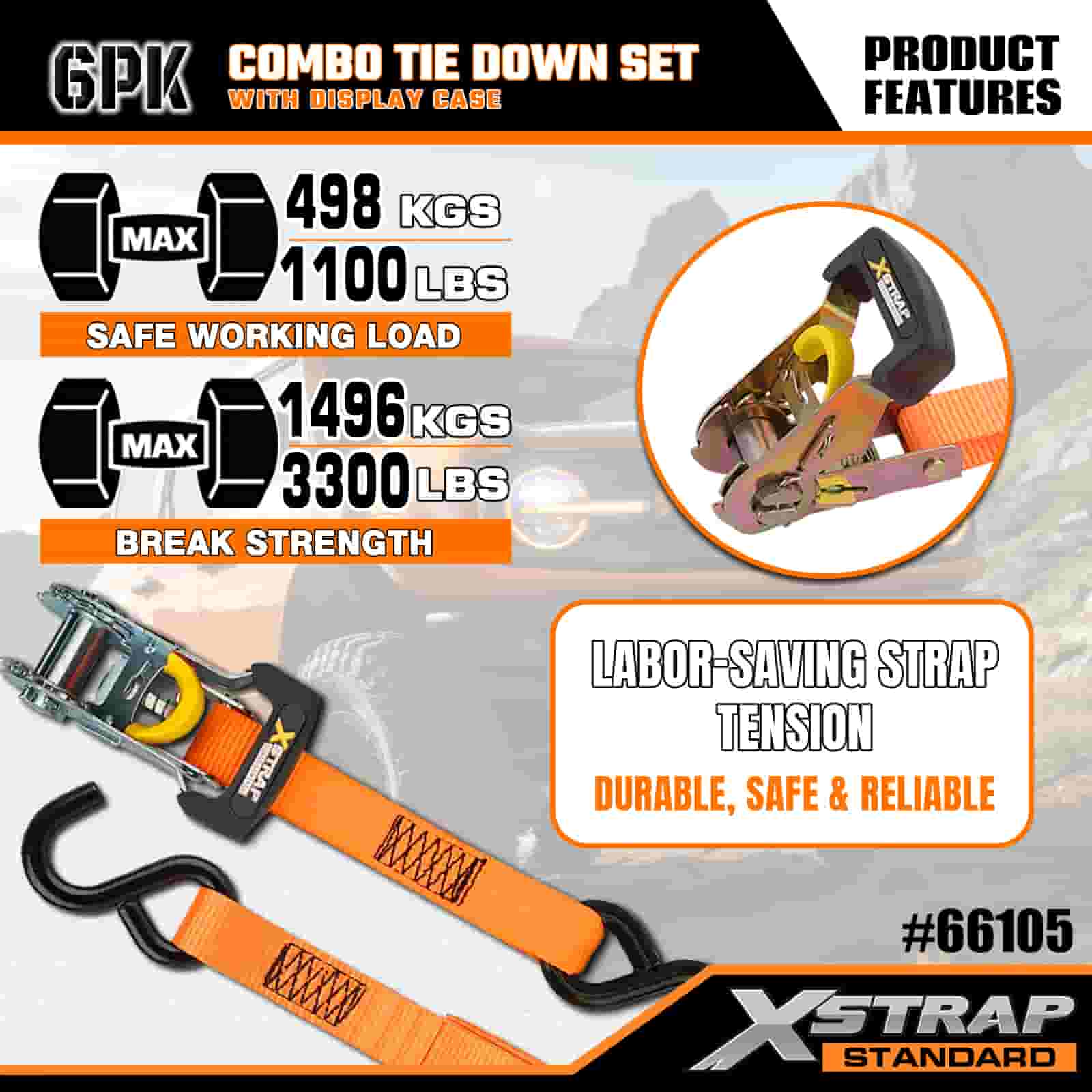 Xstrap 6 Pack Aluminium Ratchet Tie Down, 1” x 14″ og 1” x 10″ Polyester Tie Down Strap Pull Ratchet Strap, 500lbs og 1100lbs Kapasitet Lastesurring Sikringsstropper med S-kroker for Cargo Rack-kontroll, SU-motorsykkel.