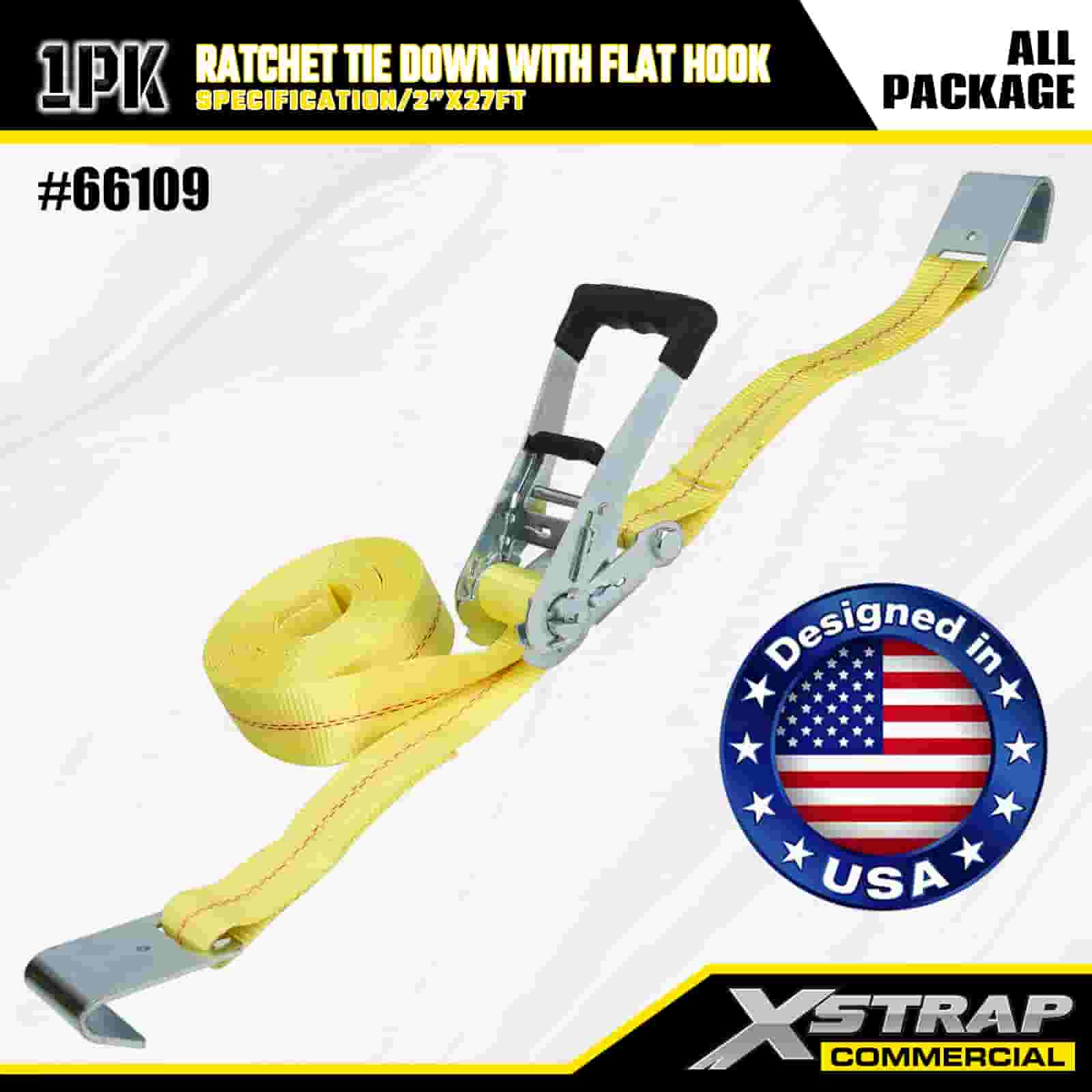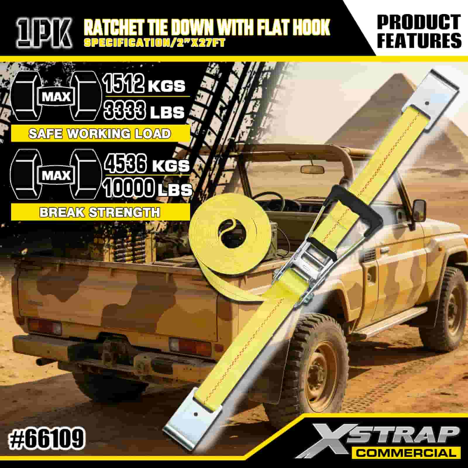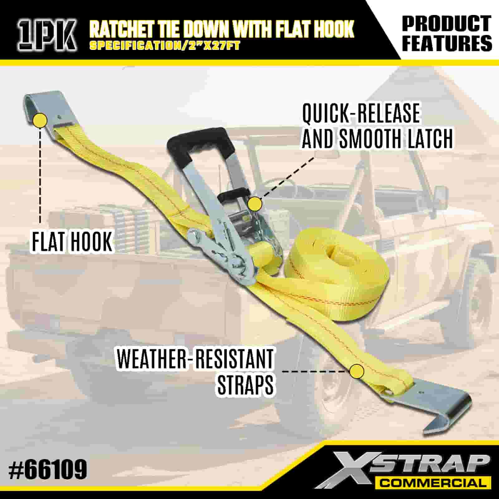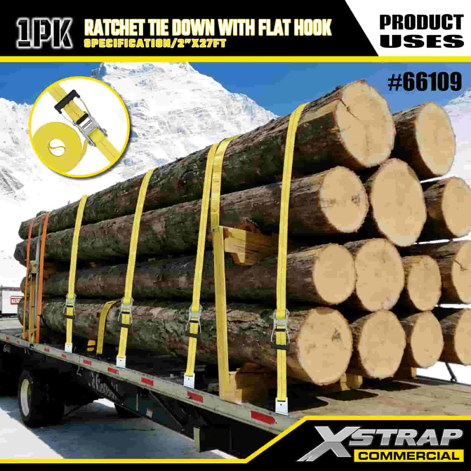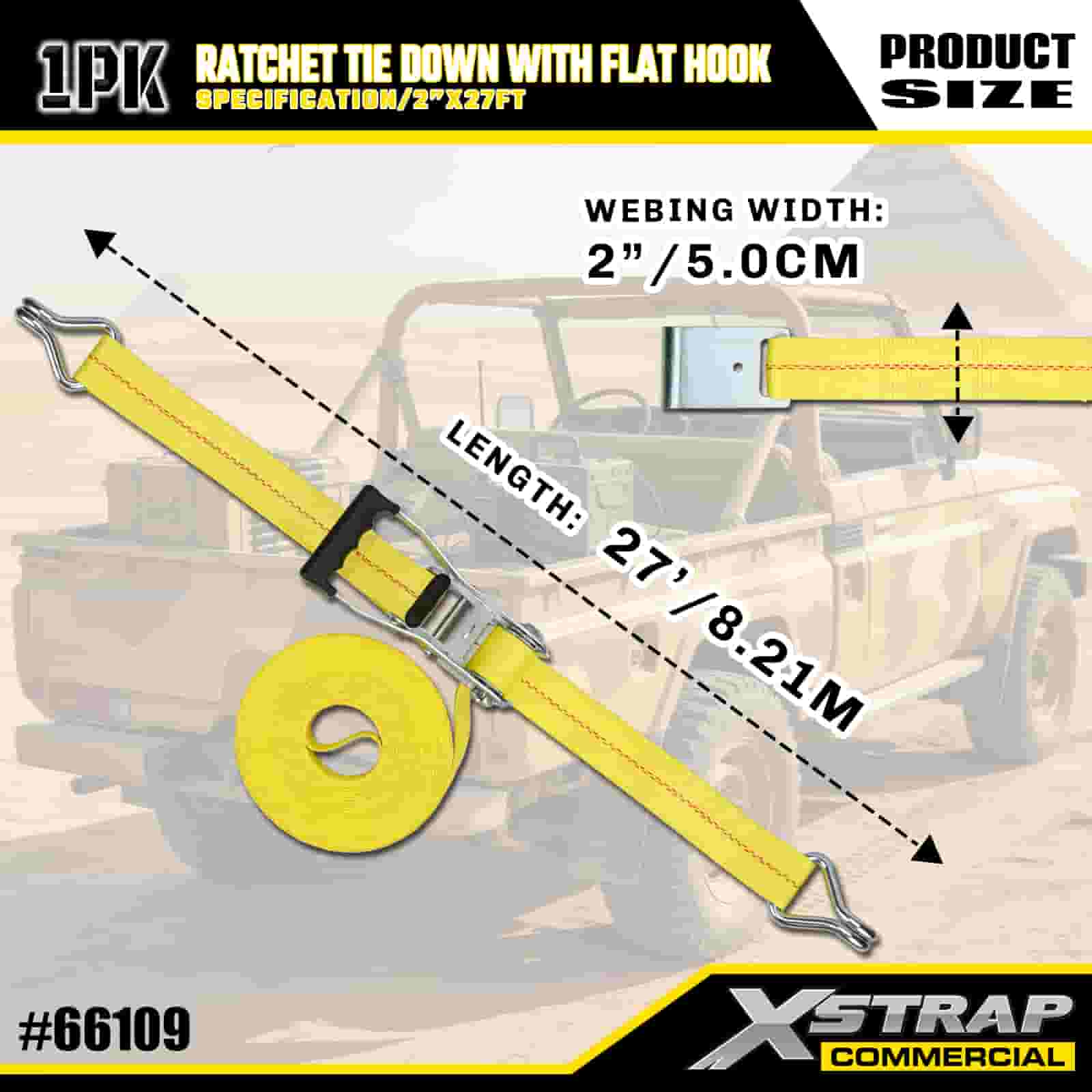 Xstrap Ratchet Tie Down med flate kroker, 2” x 27’ Polyester Tie Down Strap Trekk Ratchet Strap, 3333lbs Kapasitet Laste surring Sikringsstropper med flate kroker for lastekontroll Pickup, SUV, bil topp stativer Motorsykkel,.