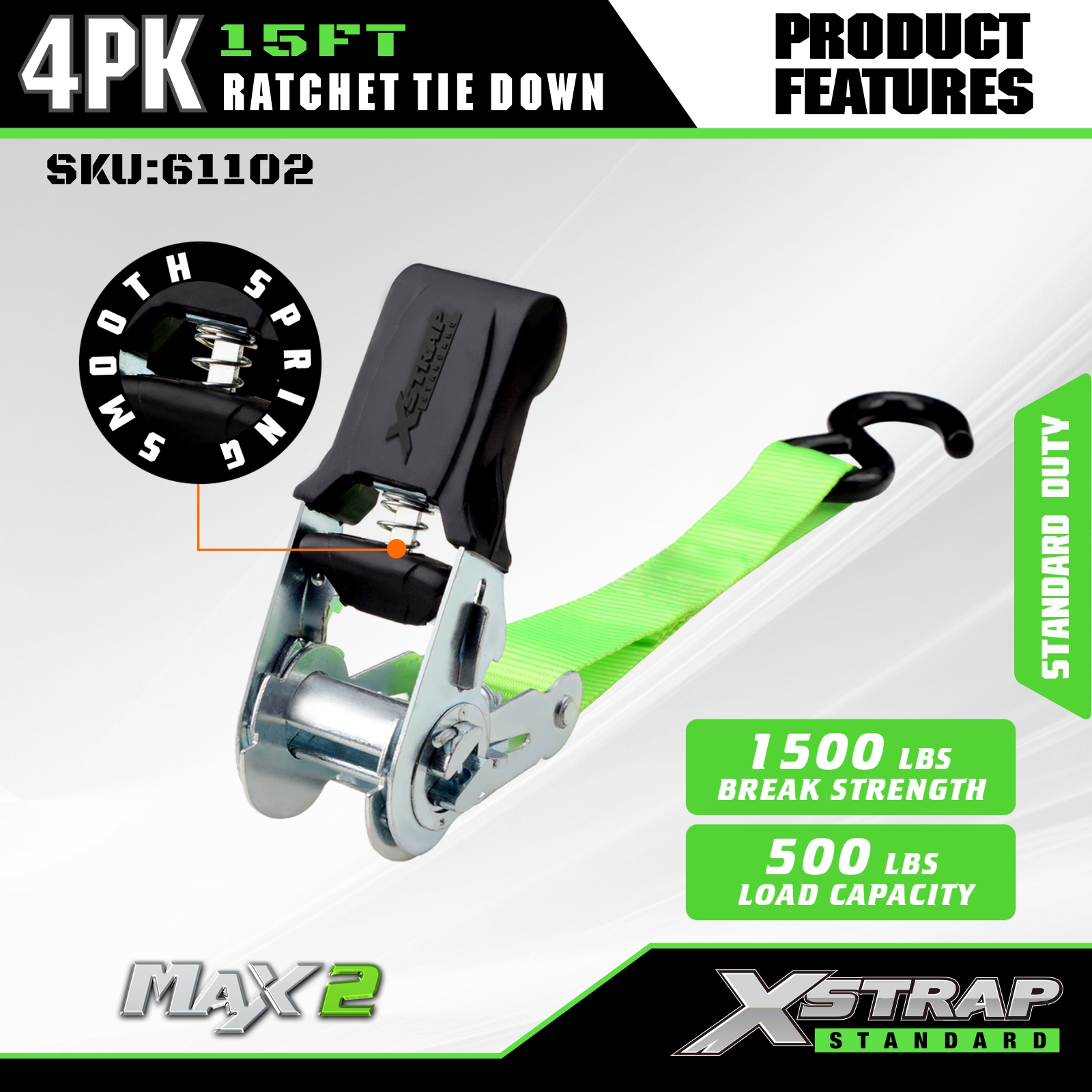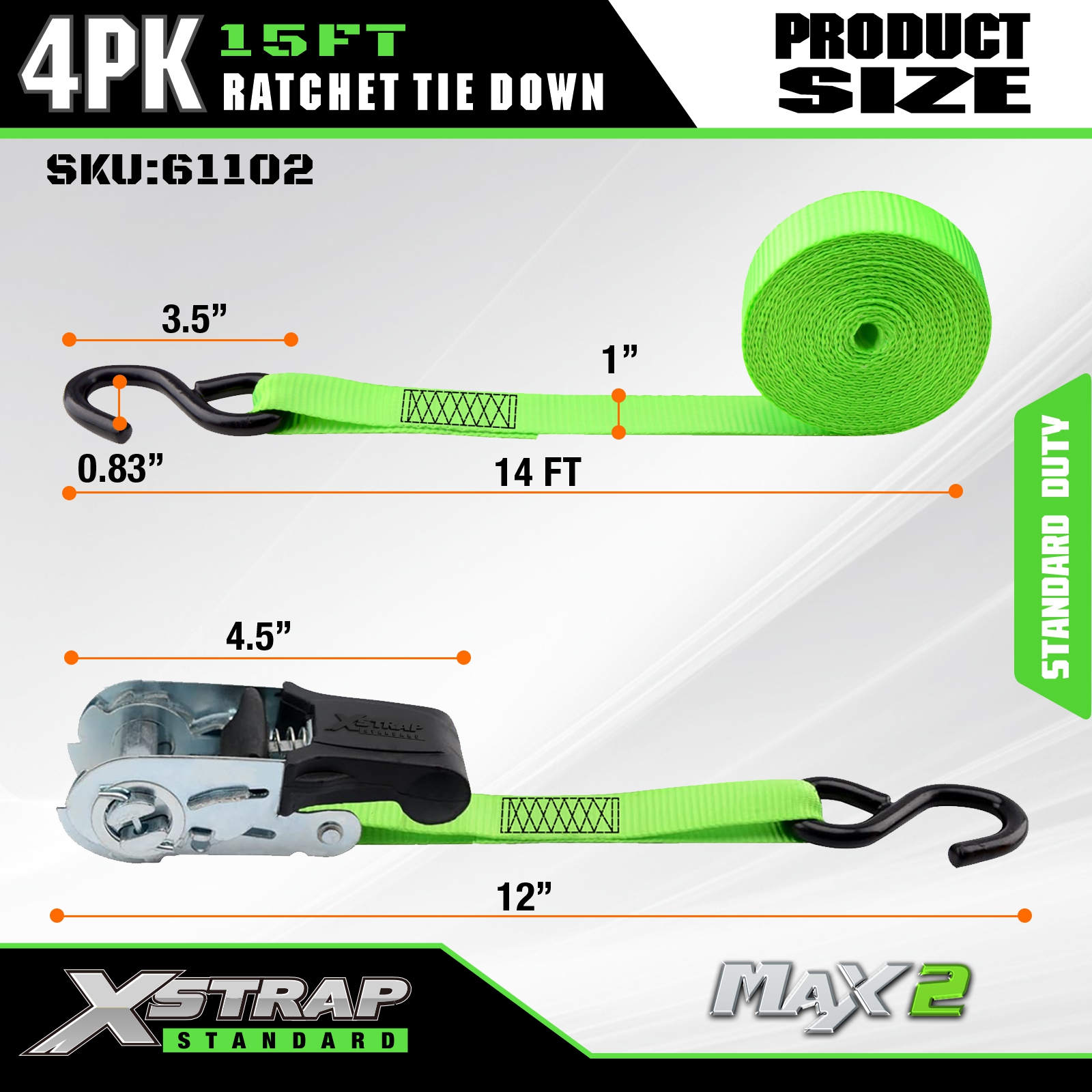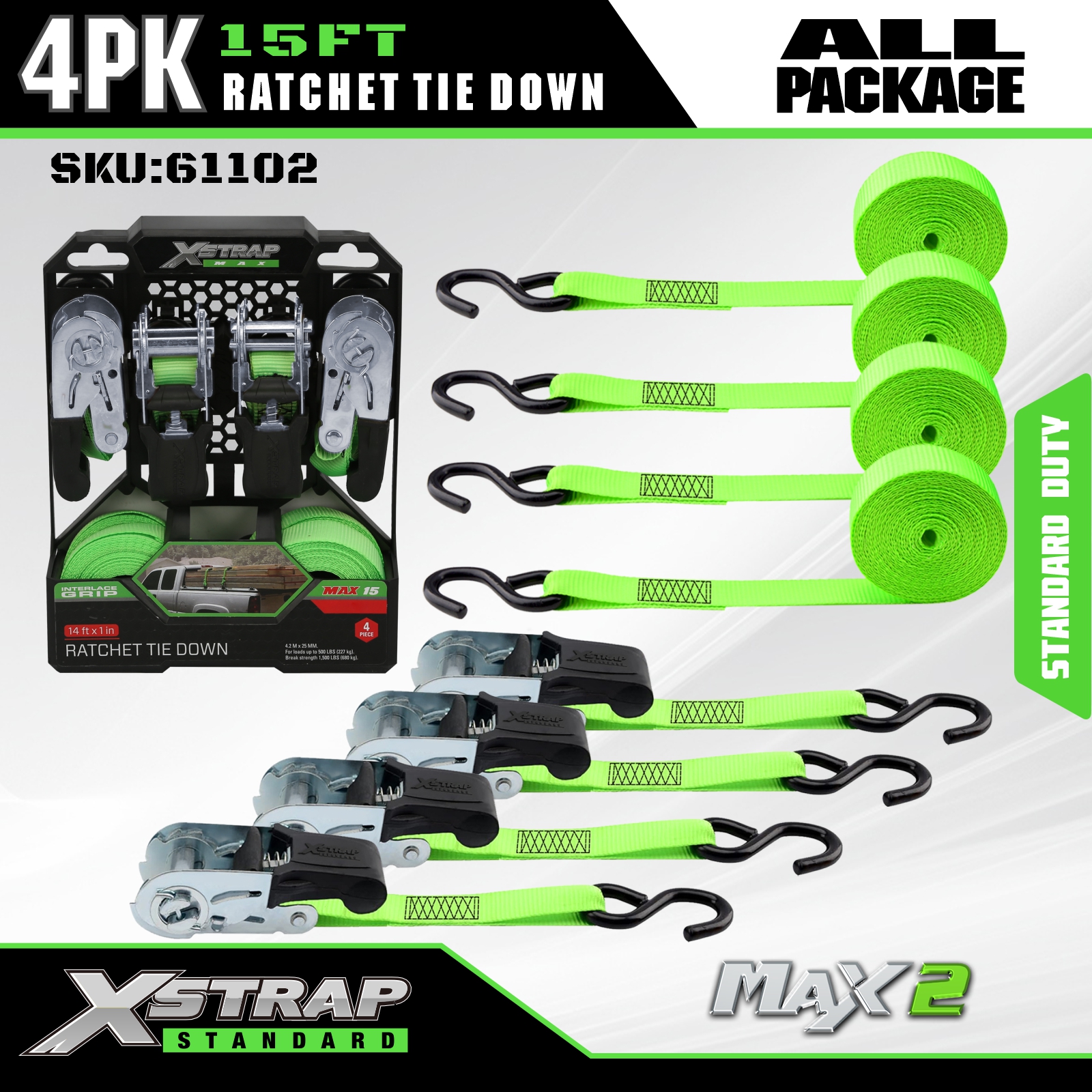 Xstrap Ratchet Tie Down Straps 4 PK 15Ft- 500 Lbs Lastekapasitet 1500 Lbs Breakstyrke-lasteremmer for flytting av apparater, plenutstyr, motorsykkel.