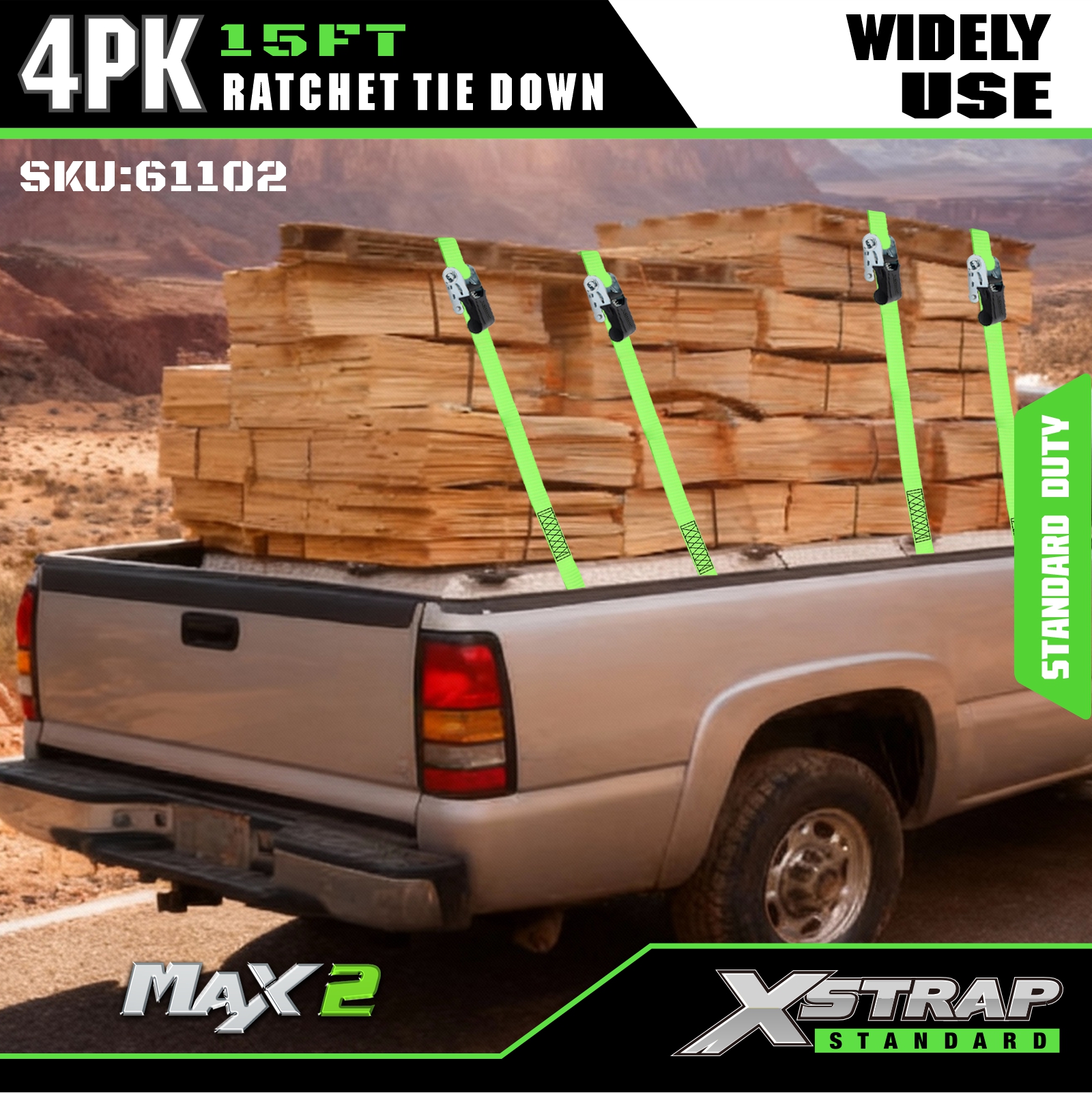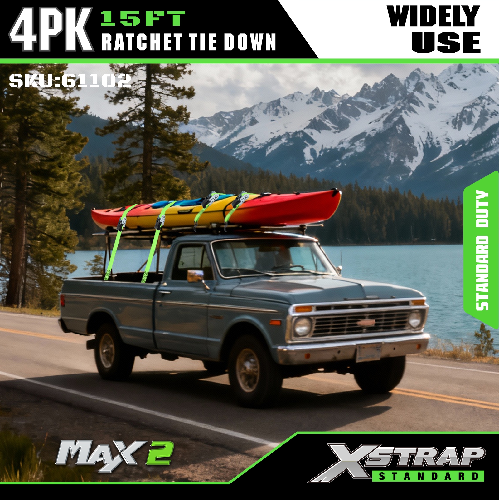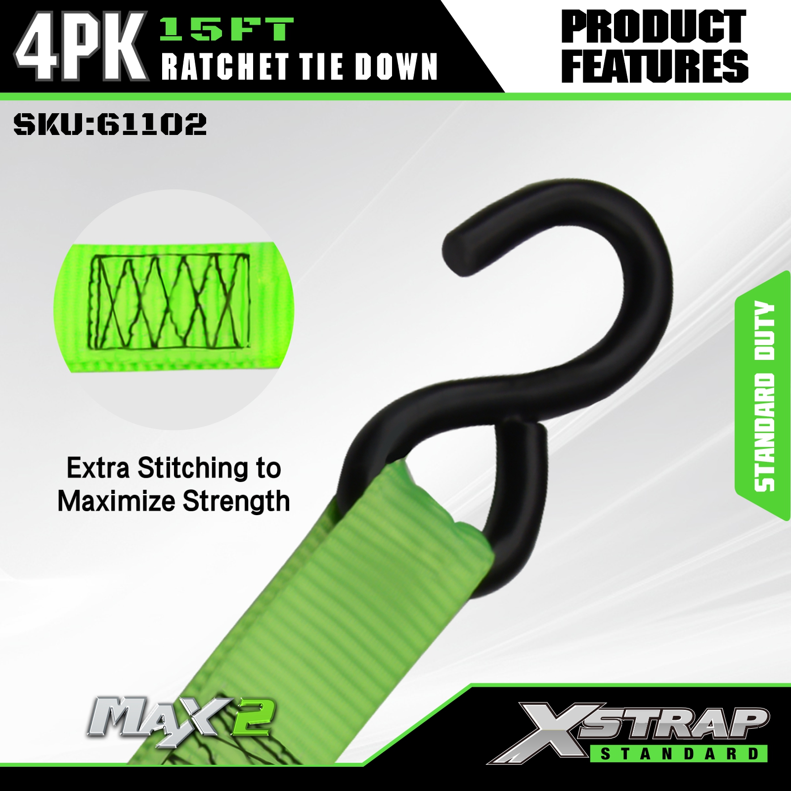 - Beskyttende gummibelagte S-kroker: Utstyrt med gummibelagte S-kroker i stål som effektivt forhindrer riper og skader på lasten og kjøretøyets overflater. Ideell for sikring av last i lastebiler i bevegelse, UTV-er, ATV-er, grussykler, motorsykler og som viktig lastebiltilbehør.