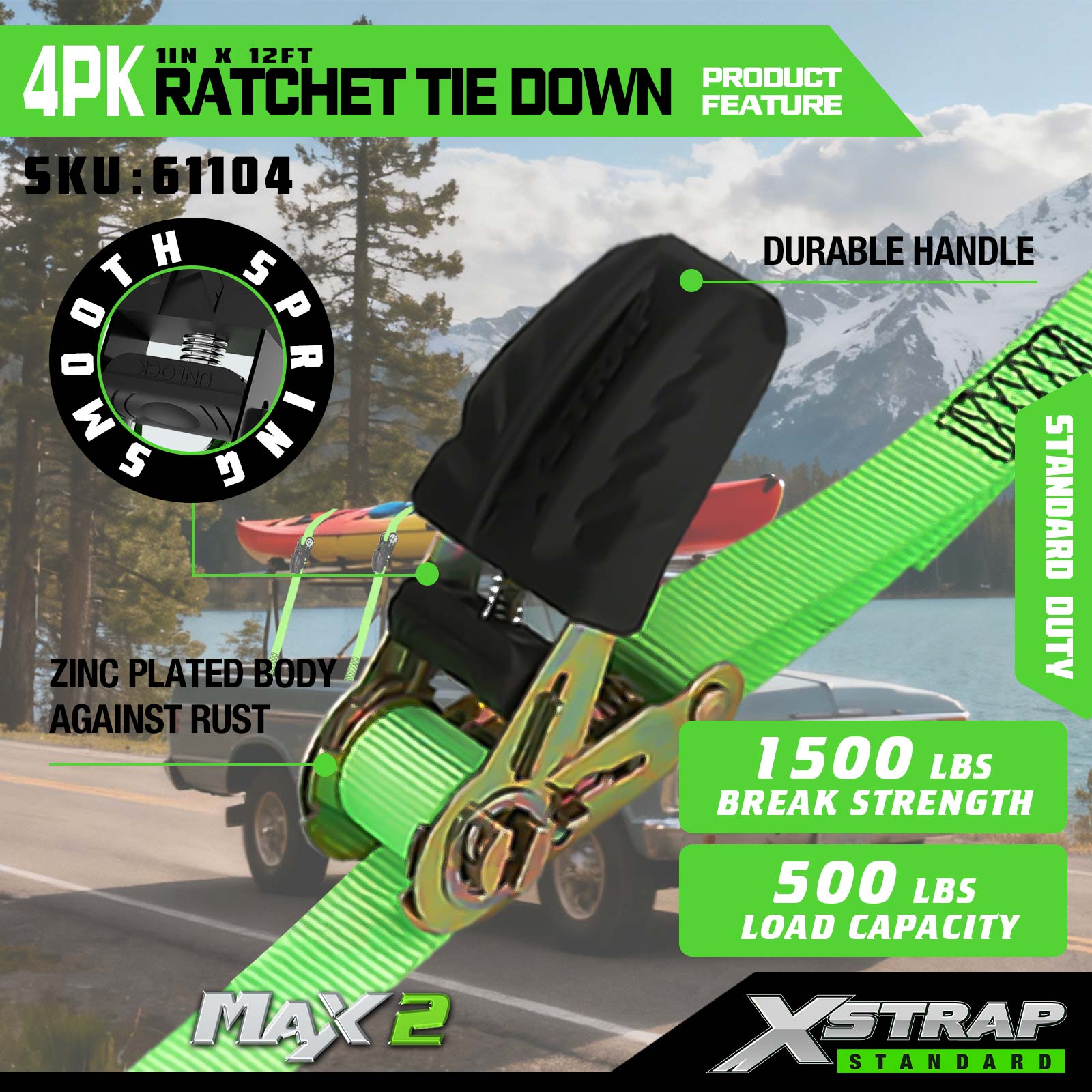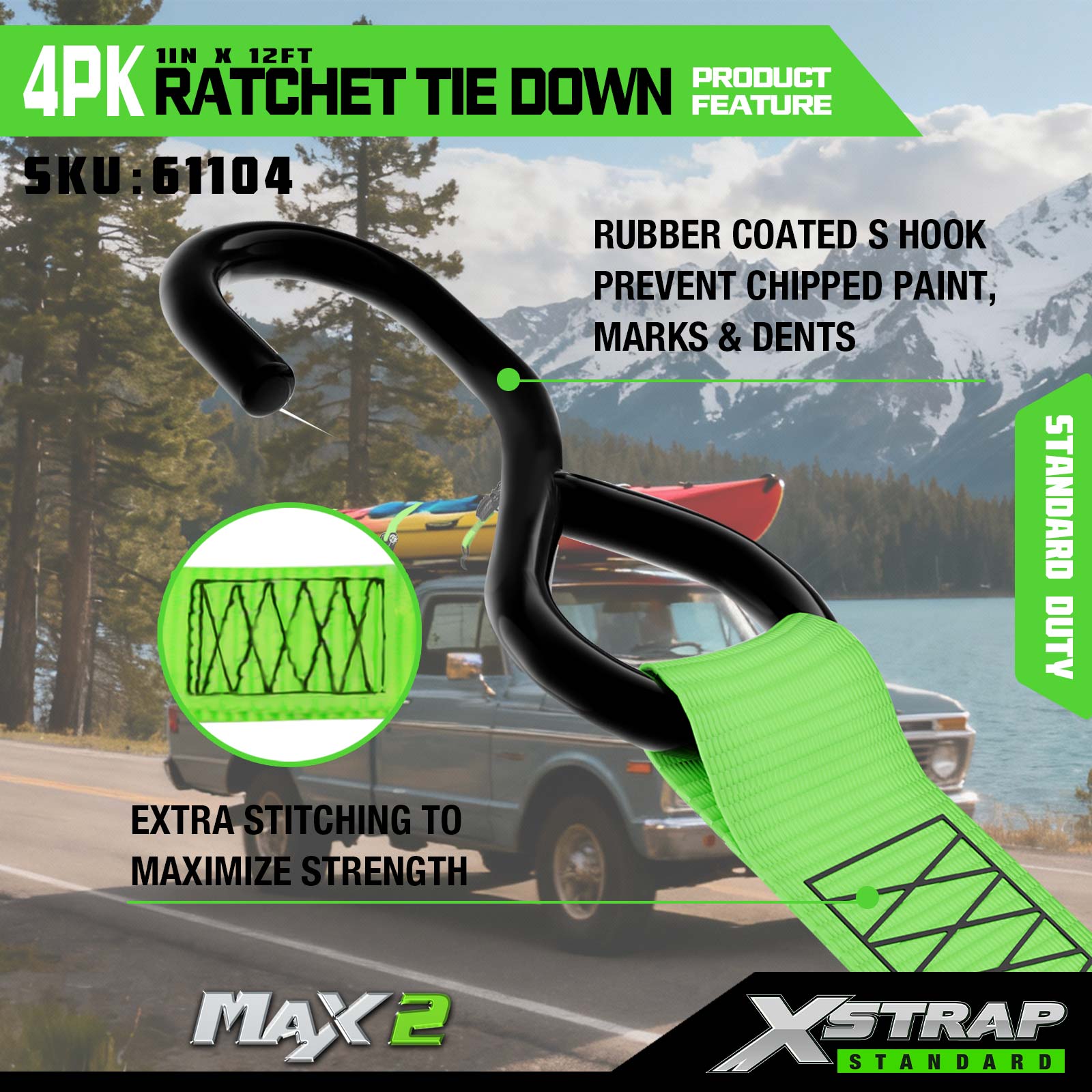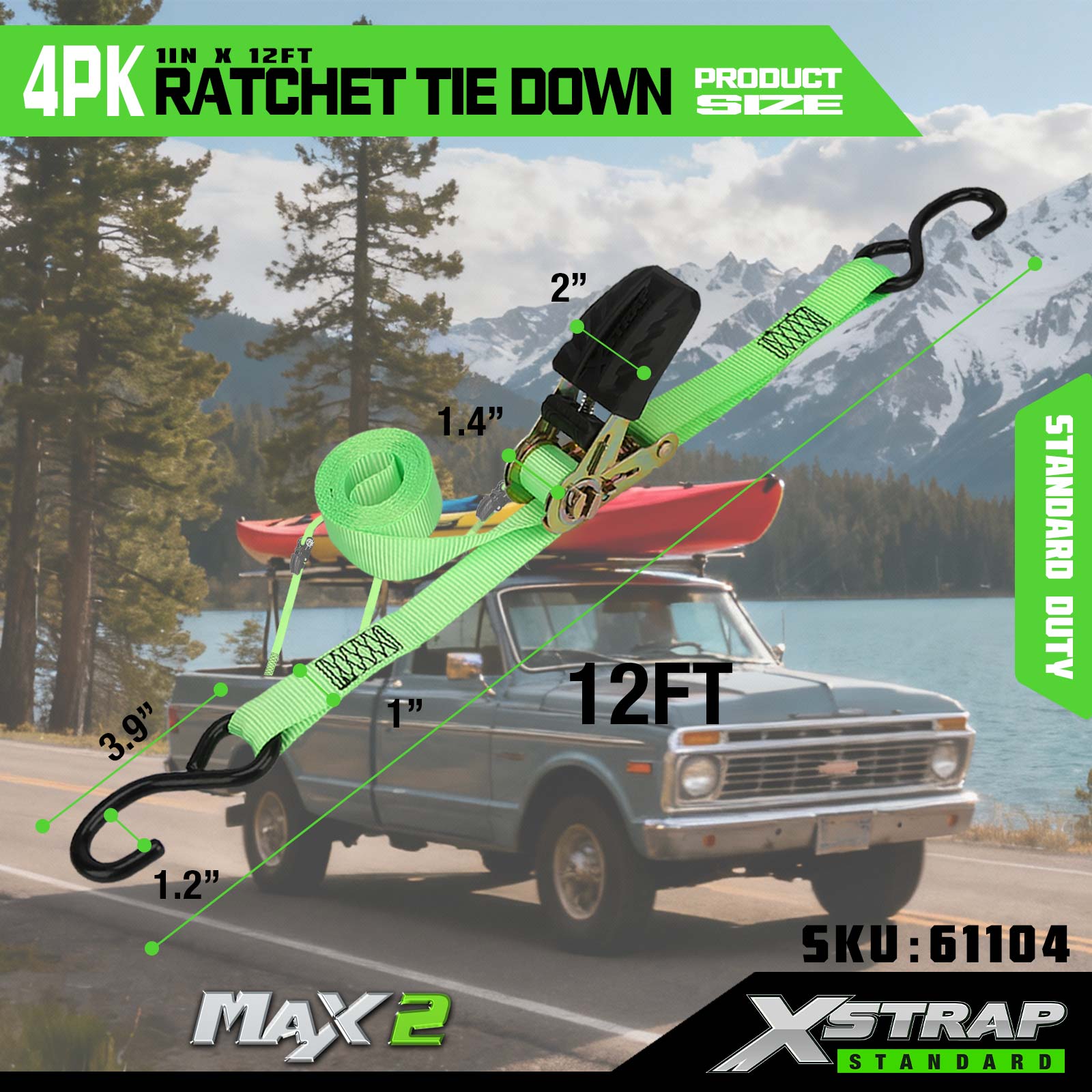 Xstrap 4 Pack Ratchet Tie Down, 1" x 12" Polyester Tie Down Strap Trekk Ratchet Strap, 500lbs Kapasitet Laste Surring Sikringsstropper med S-kroker for lastebil, lett tilhengermotorsykkel, lett fiskebåt, jetski, snøscooter.