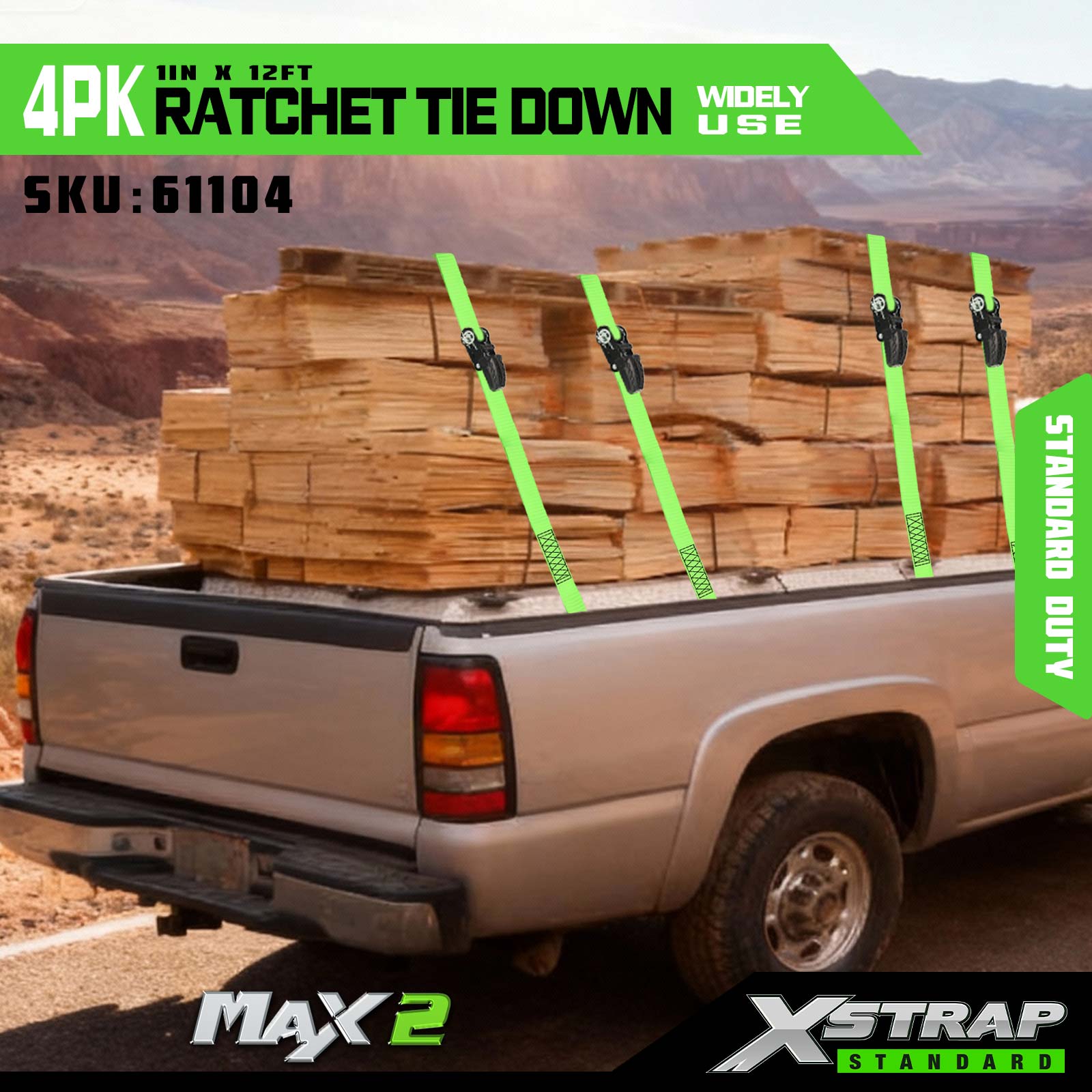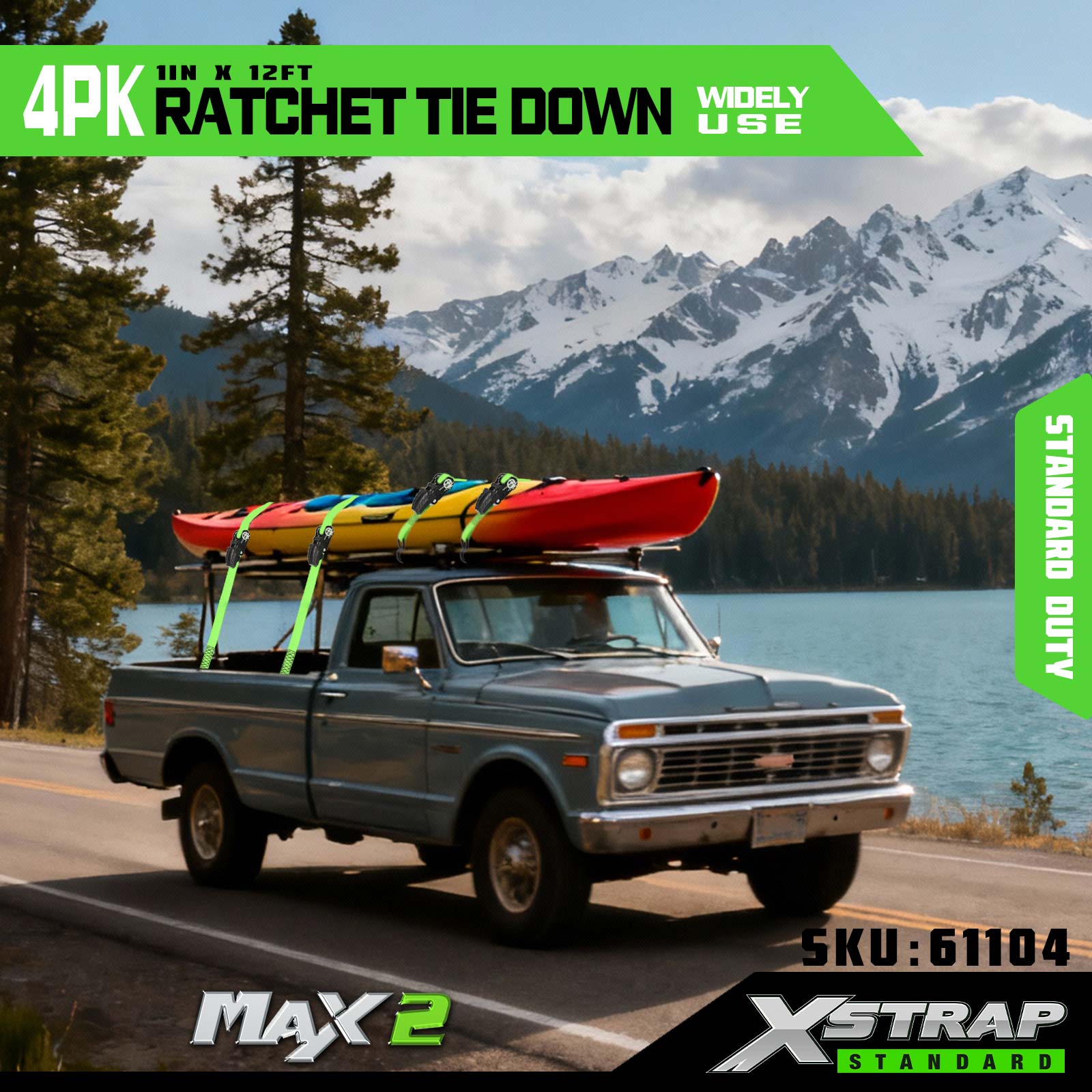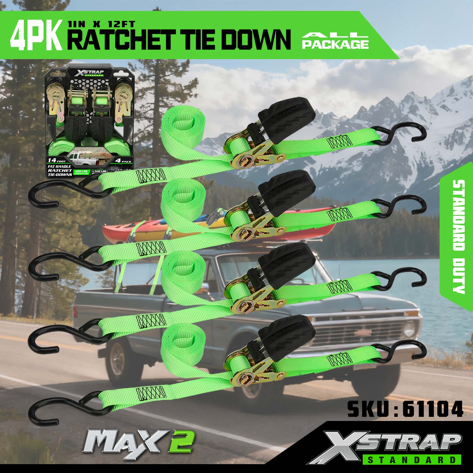 Xstrap 4 Pack Ratchet Tie Down, 1" x 12" Polyester Tie Down Strap Trekk Ratchet Strap, 500lbs Kapasitet Laste Surring Sikringsstropper med S-kroker for lastebil, lett tilhengermotorsykkel, lett fiskebåt, jetski, snøscooter.