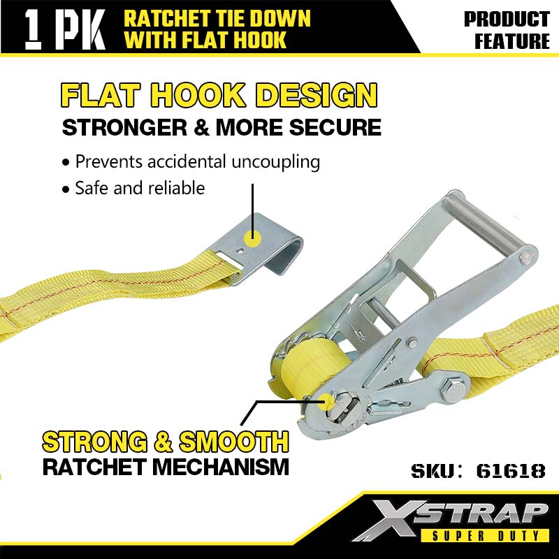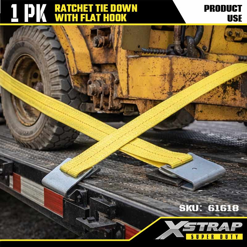 Xstrap Ratcet Tie Down med flat kroker, 2” x 27’ Polyester Tie Down Strap Skrallestropp, 3333lbs Kapasitet Cargo Surring Sikringsstropper med flat kroker for Heavy Duty Trailer, Flat Bed Trailer Skibåt, Småbil, Tungt Utstyr.