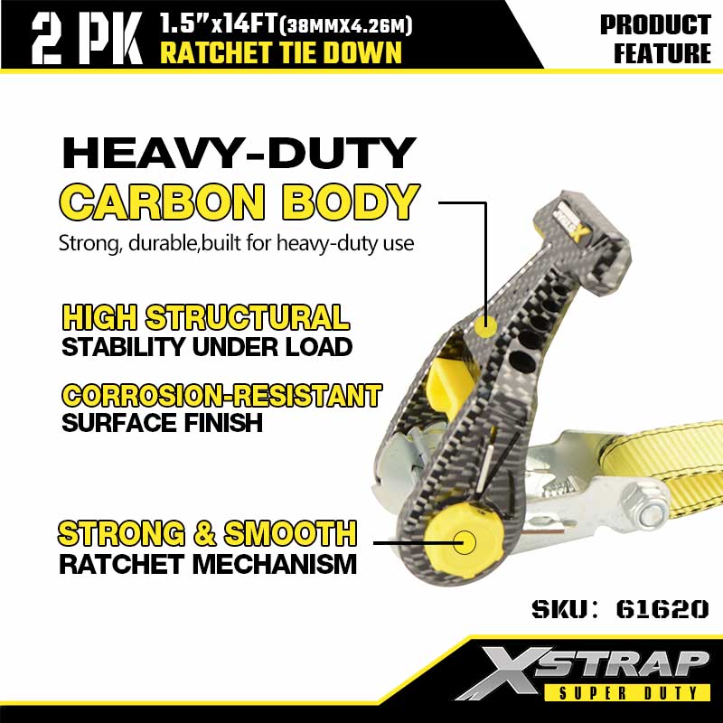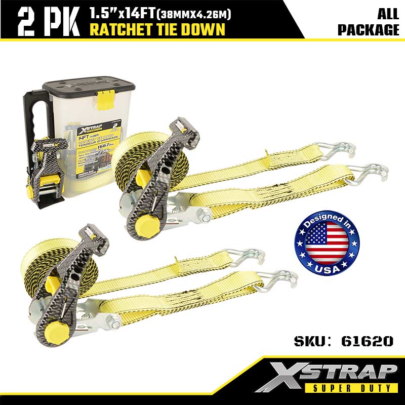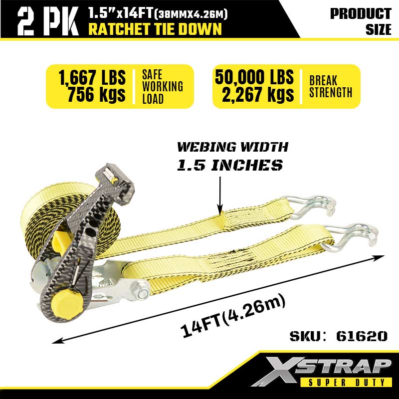 Xstrap 2PK Ratcet Tie Down med dobbel J-kroker, 1-1/2" x 14" Polyester Tie Down Strap Ratchet Strap, 1667lbs Kapasitet Cargo Surring Sikringsstropper med Double J-kroker for Heavy Duty Trailer, Flat Bed Trailer Skibåt, Småbil, Tungt.