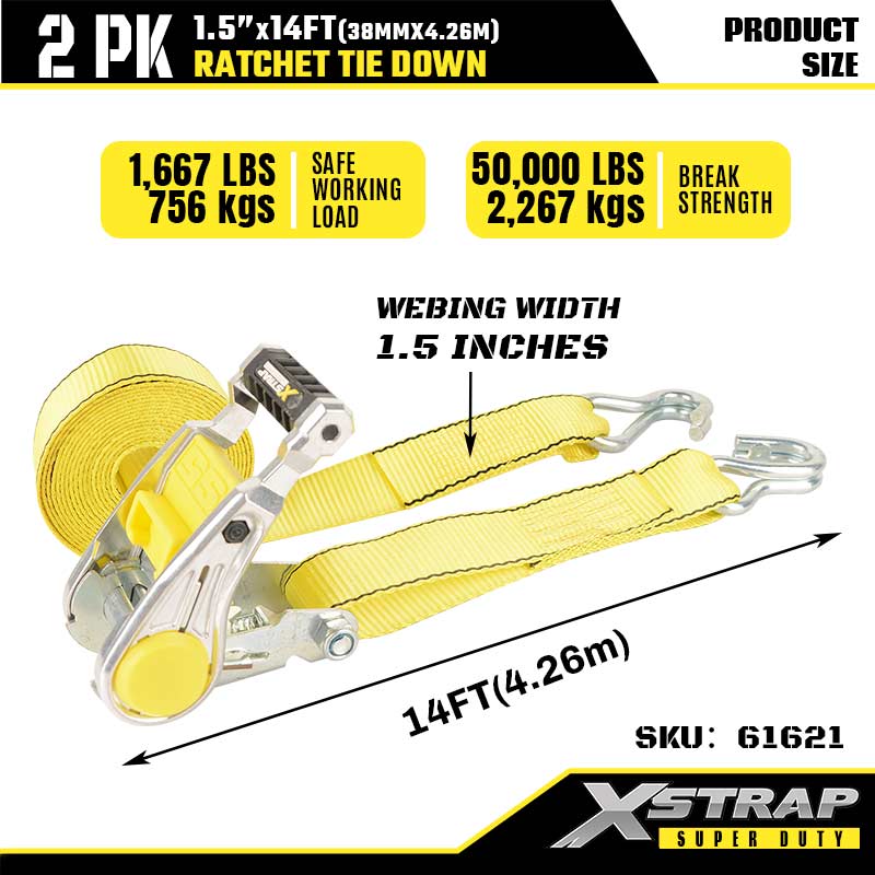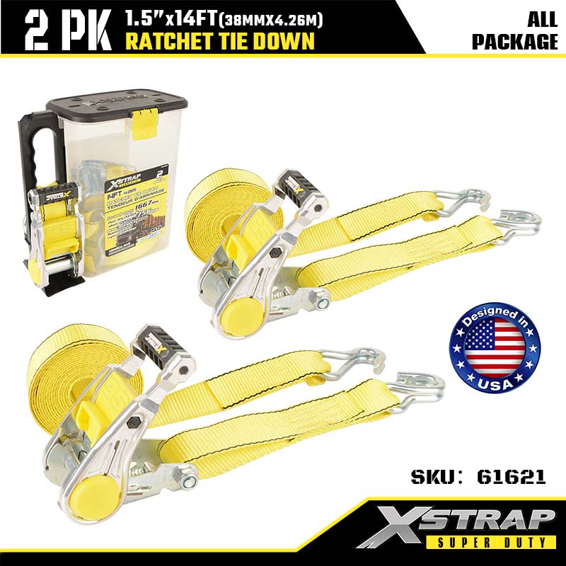 Xstrap 2PK Ratcet Tie Down med dobbel J-kroker, 1-1/2" x 14" Polyester Tie Down Strap Ratchet Strap, 1667lbs Kapasitet Cargo Surring Sikringsstropper med Double J-kroker for Heavy Duty Trailer, Flat Bed Trailer Skibåt, Småbil, Tungt.