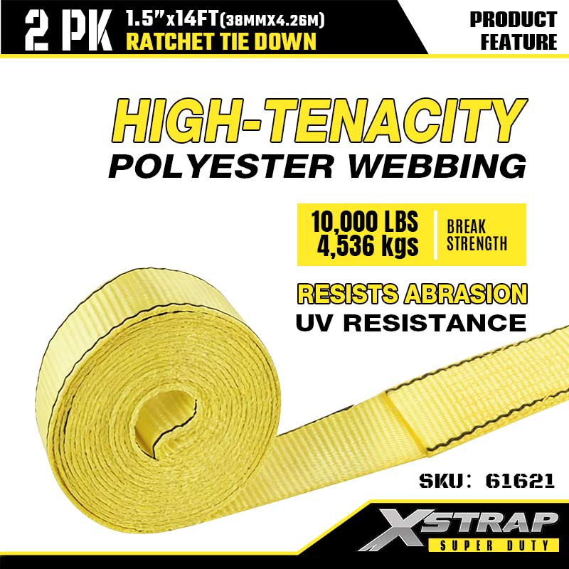 - High Tenacity Polyester Webbing: Den 1,5-tommers brede polyestervevet motstår slitasje, trekking og UV-skader, slik at den tåler sol, regn og ulendt terreng. Det er tøft nok for byggematerialer og skånsomt nok til å beskytte utendørsutstyret ditt mot riper.